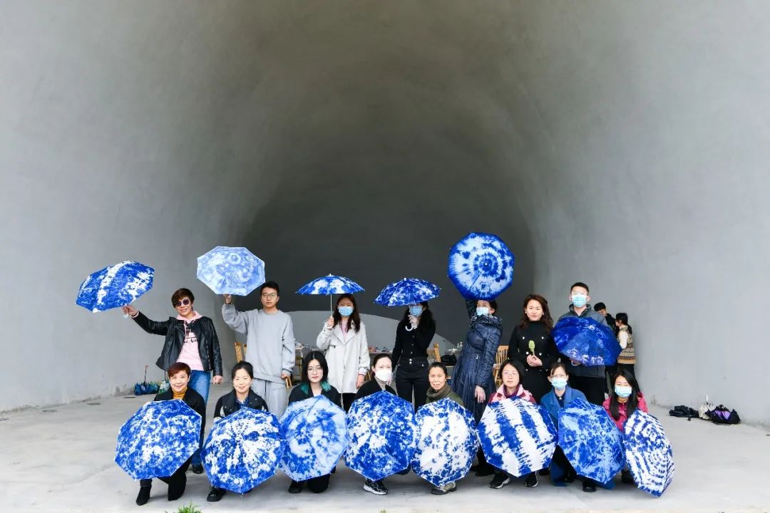 最后,大家把染好的印花布清洗后,撑在伞架上,完成了属于自己的扎染艺术作品。撑起这把靛蓝、青白的雨伞,就好像为自己撑起了一片微缩的晴朗天空。